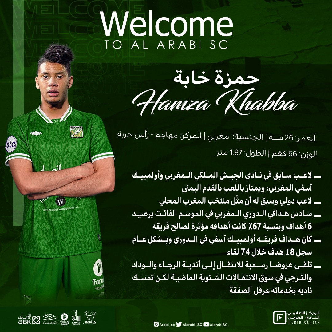 كشف نادي العربي الكويتي أحد أفضل الأندية بالبطولة الكويتية، عبر حسابه الرسمي بموقع التواصل الإجتماعي "تويتر"، أن إدارته نجحت في عقد صفقة مع مهاجم أولمبيك آسفي، حمزة خابا، بموجبها سيمارس ضمن النادي الكويتي لمدة موسمين، بدء من الموسم القادم.