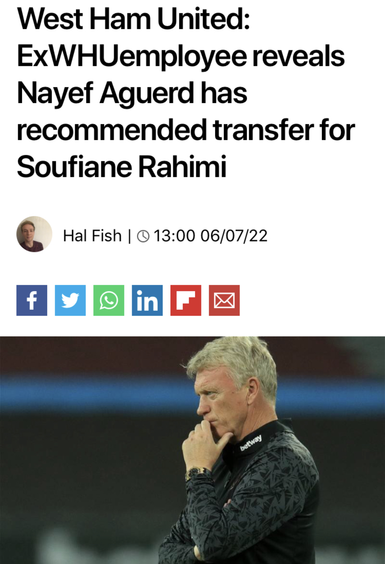 يبدي ويست هام يونايتد اهتمامه بمهاجم الرجاء السابق سفيان رحيمي، حسب ما ذكره لاعب سابق في الفريق الإنجليزي الذي أكد أن اهتمام هذا الأخير بالمهاجم المغربي جاء بناء على توصية من نايف أكرد الدولي المغربي الذي تعاقد معه ويست هام قبل أيام قليلة بعقد مدته 5 مواسم.