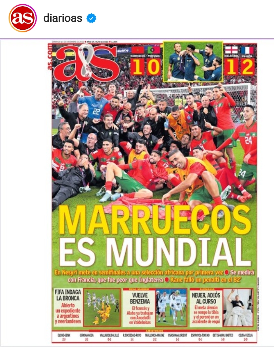 إسوة بصحف العالم التي انبهرت بما حققه المنتخب الوطني في كأس العالم بقطر، بوصوله للدور نصف النهائي، فإن صحيفة «آس» الإسبانية أفردت صفحتها الأولى وكثيرا من صفحاتها الداخلية للحديث عن الإنجاز المغربي ووضعت صورة عملاقة لاحتفال أسود الأطلس بإنجازهم التاريخي، ووضعت عنوانا لذلك قالت فيه: «المغرب هو المونديال».