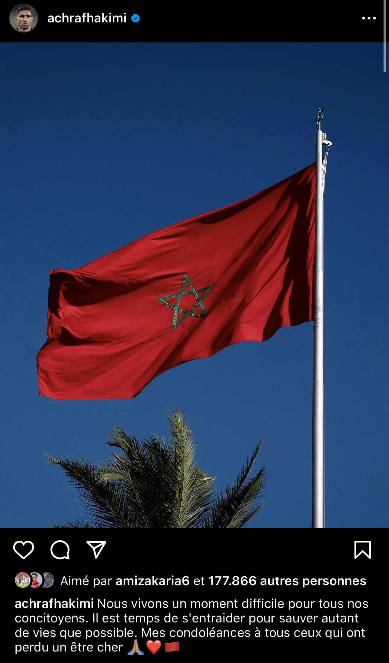 قال أشرف حكيمي لاعب المنتخب الوطني بأنه حزين لما وقع في بعض المناطق المغربية جراء الزلزال المدمر الذي ذهب بالمئات من الضحايا والمصابين.