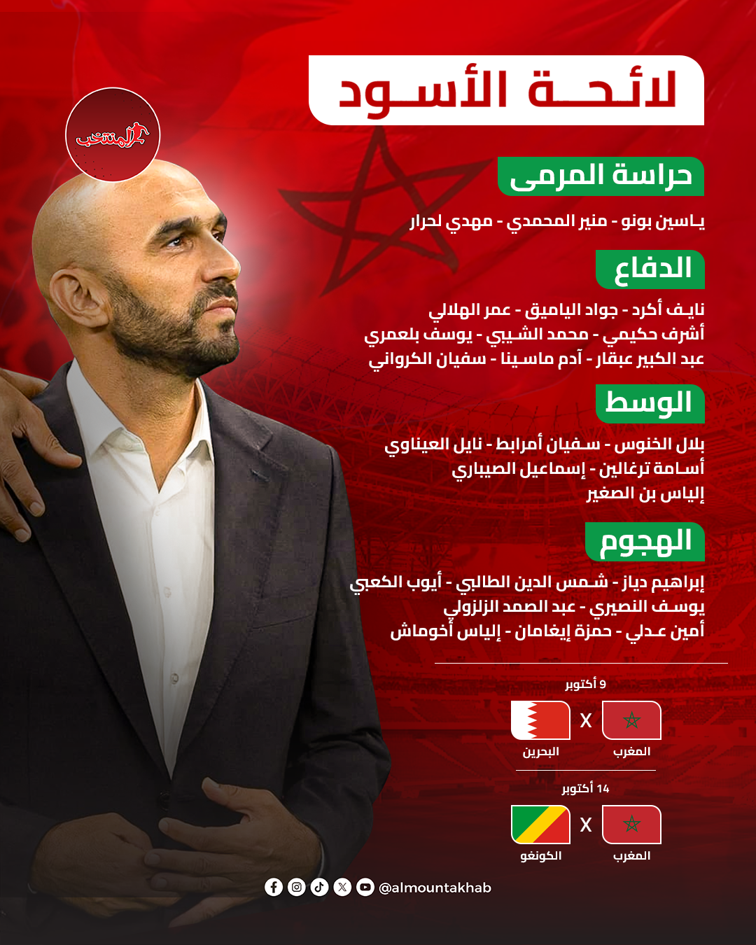 سيواجه المنتخب المغربي نظيريه البحريني والكونغولي في 9 و14 أكتوبر الجاري، ولهذا الغرض أعلن الناخب الوطني وليد الركراكي لائحة الفريق الوطني خلال الندوة الصحفية التي عقدها اليوم الخميس داخل مركب محمد السادس لكرة القدم بمدينة سلا.