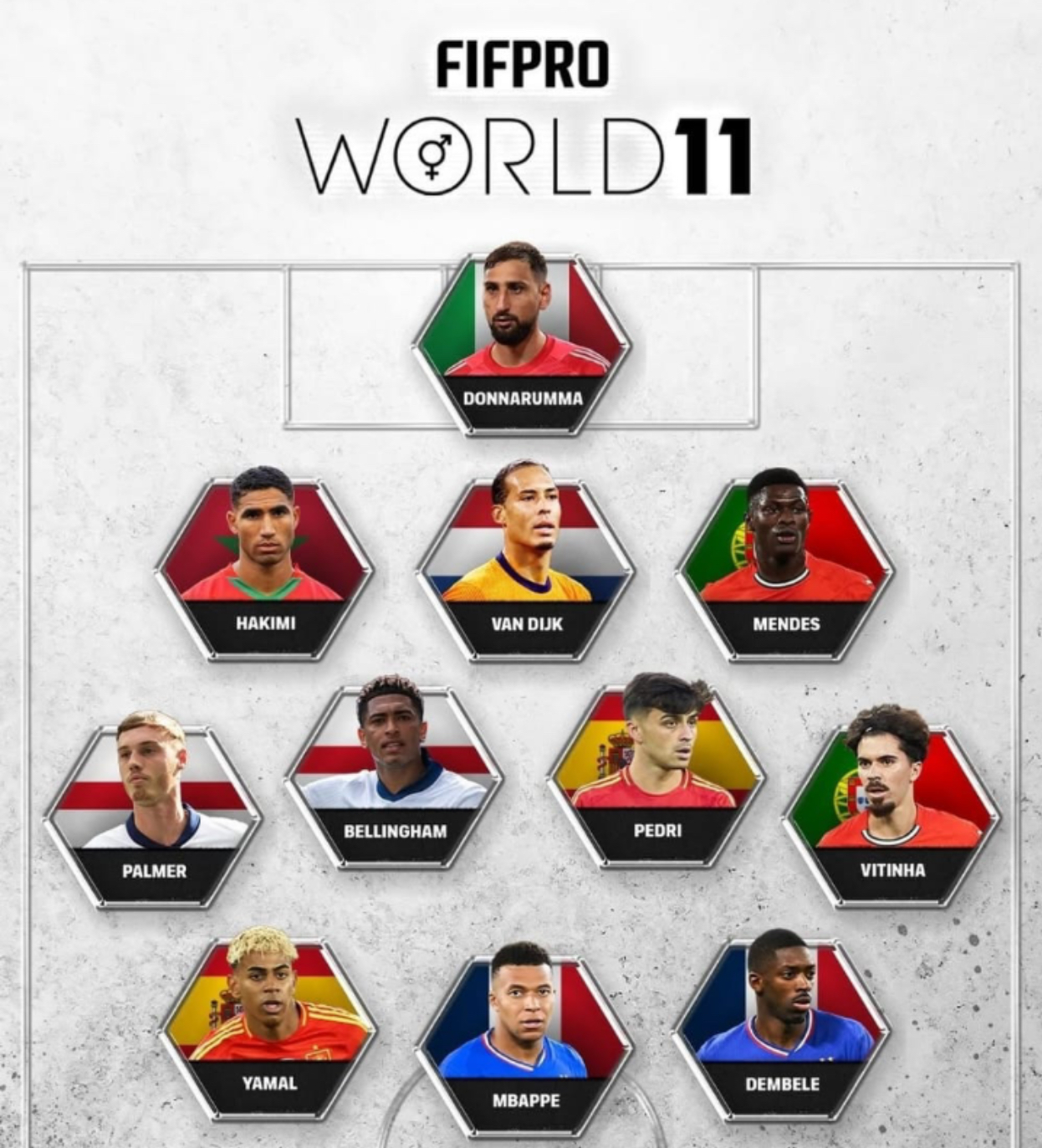 وضم هذا التشكيل الأسد المغربي الدولي أشرف حكيمي، أفضل ظهير أيمن بالعالم، رفقة مجموعة من اللاعبين الذين تألقوا في المنافسات الدولية، من ضمنهم المهاجم الفرنسي عثمان ديمبيلي الفائز بالكرة الذهبية لأفضل لاعب بالعالم، والجناح الأيمن جمال لامين (يامال)، الدولي الإسباني لاعب برشلونة.