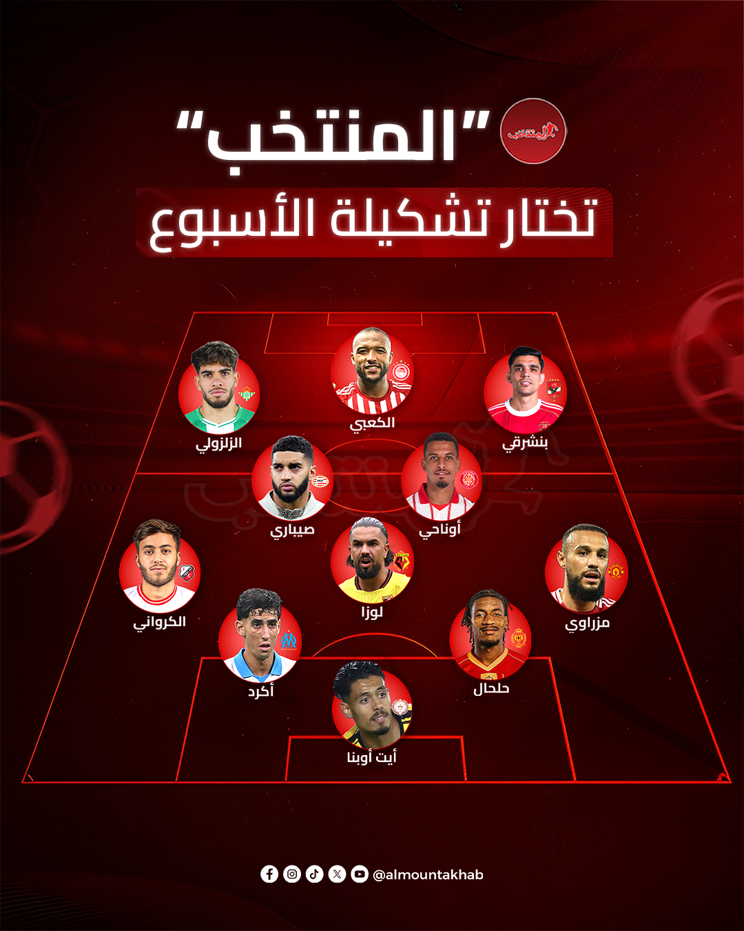 • الهجوم: أشرف بنشرقي (الأهلي) - عبد الصمد الزلزولي (بيتيس) - أيوب الكعبي (أولمبياكوس)