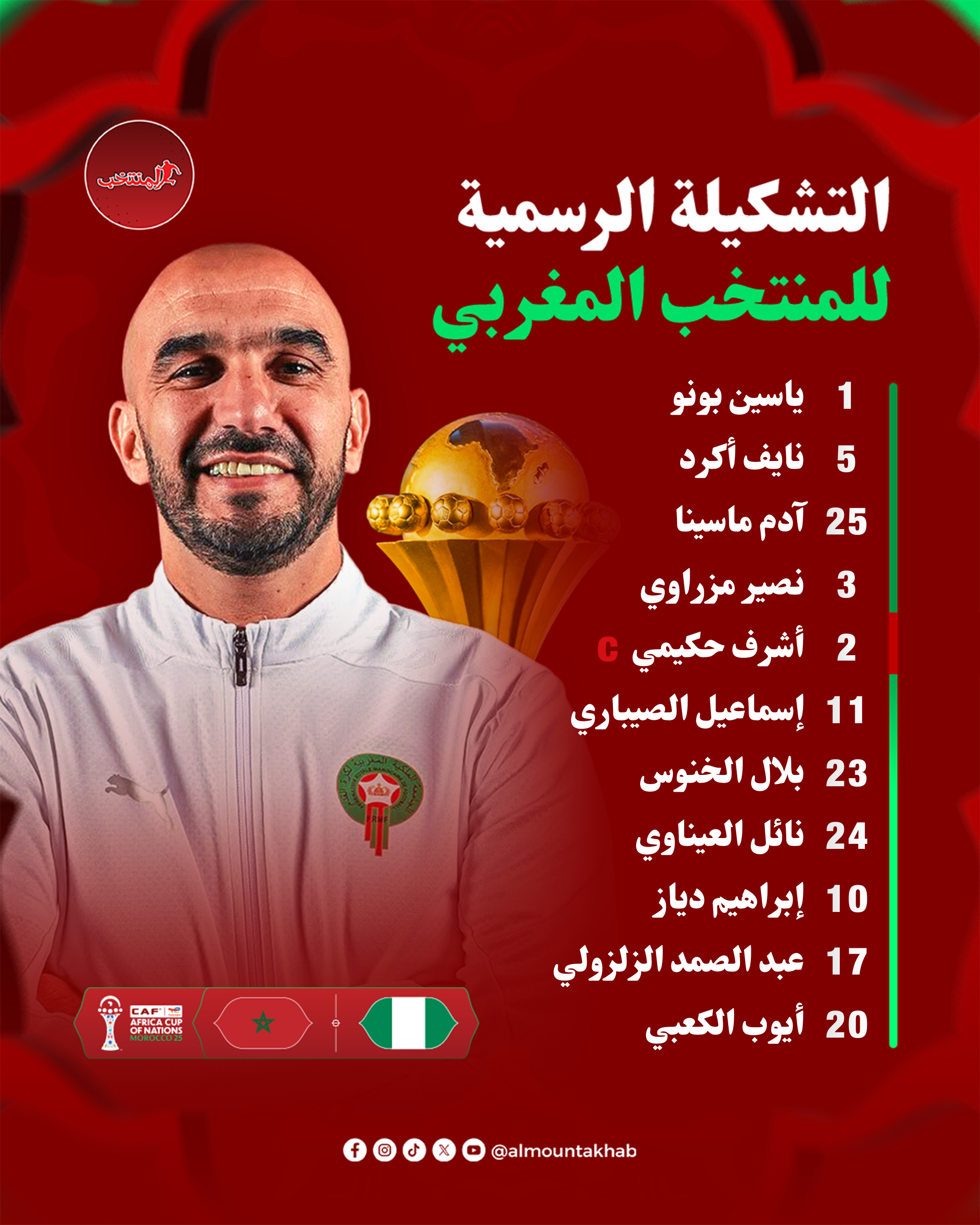 وإختار وليد الركراكي التشكيلة التالية لملاقاة نسور نيجيريا،بملعب الأمير مولاي عبدالله بالرباط.
